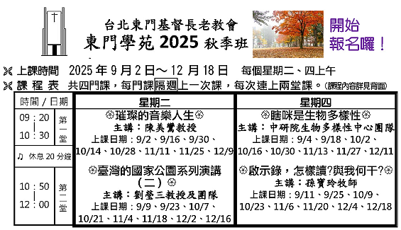 上課時間: 2025 年 9 月 2 日~12 月 18 日 每個星期二、四上午。
